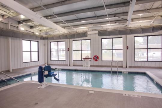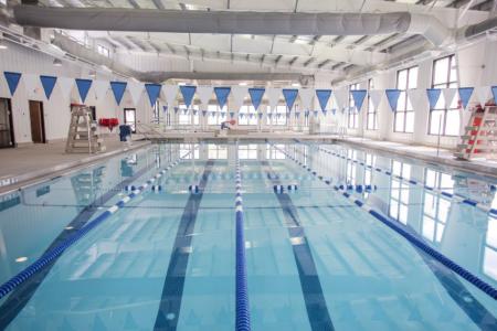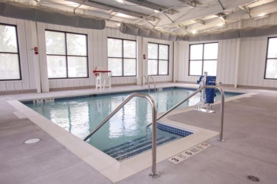 The small training and activity pool is 20’ X 40’ with egress steps. The larger pool, also includes 15’ wide egress steps , and was designed for adult lap swimming and competitive meets.